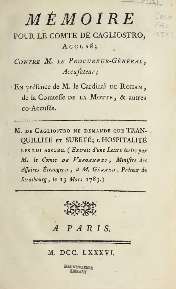 1766 has him travelling to Rhodes and Malta where he takes on the name Cagliostro and adopts Christian dress. He is well received by the Knights of Malta. Later in the text he suggests that his date of birth was 1750 {by subtraction} and that he arrived in Strasbourg in 1780. From his narrative he had access to some high ranking and important geezers. Pretty soon he ends up in the Bastille. The memoire is dated March 1783.