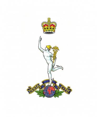 “The figure of Mercury holding a Caduceus in the left hand, the right hand aloft poised with the left foot on a globe all silver above the globe a scroll inscribed ‘Certa Cito’ and below on each side six laurel leaves all gold, the whole ensigned with the Crown in gold.
