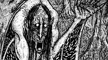 The legend of the cyhyraeth is sometimes conflated with tales of the Gwrach-y-Rhibyn or Hag of the Mist, a monstrous Welsh spirit in the shape of a hideously ugly woman – a Welsh saying, to describe a woman without good looks, goes, “Y mae mor salw â Gwrach y Rhibyn” (she is as ugly as the Gwrach y Rhibyn) – with a harpy-like appearance: unkempt hair and wizened, withered arms with leathery wings, long black teeth and pale corpse-like features. She approaches the window of the person about to die by night and calls their name, or travels invisibly beside them and utters her cry when they approach a stream or crossroads, and is sometimes depicted as washing her hands there. Most often the Gwrach y Rhibyn will wail and shriek “Fy ngŵr, fy ngŵr!” (My husband! My husband!) or “Fy mhlentyn, fy mhlentyn bach!” (My child! My little child!), though sometimes she will assume a male’s voice and cry “Fy ngwraig! Fy ngwraig!” (My wife! My wife!).
